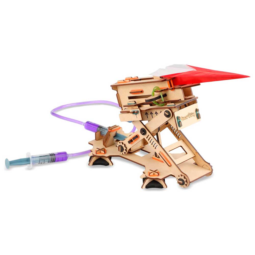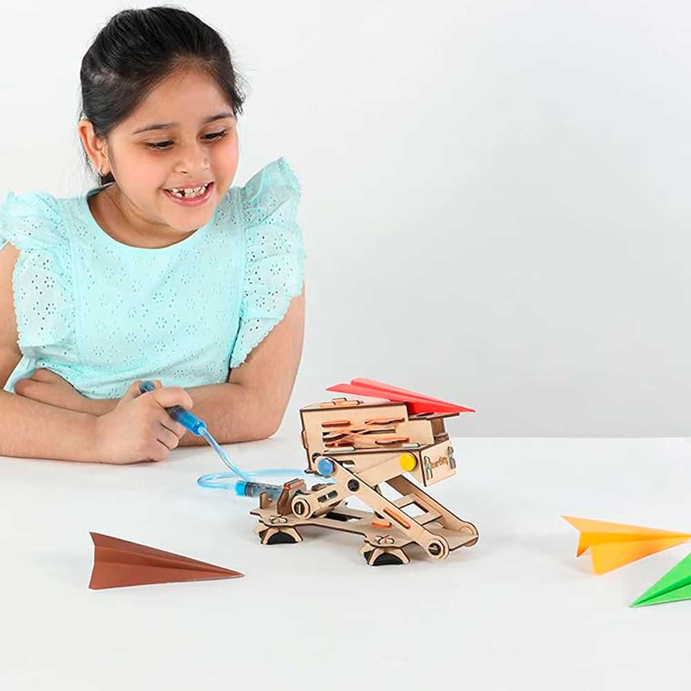 Construye, juega ¡y vuela alto! El Lanzador Hidráulico de Aviones Smartivity es el kit STEAM perfecto para que niños y niñas (a partir de 6 años) aprendan sobre hidráulica, aerodinámica y mecanismos de tijera mientras crean su propio lanzador de madera. Incluye piezas precortadas, jeringas, gomas, hojas para hacer aviones de papel e instrucciones detalladas.
